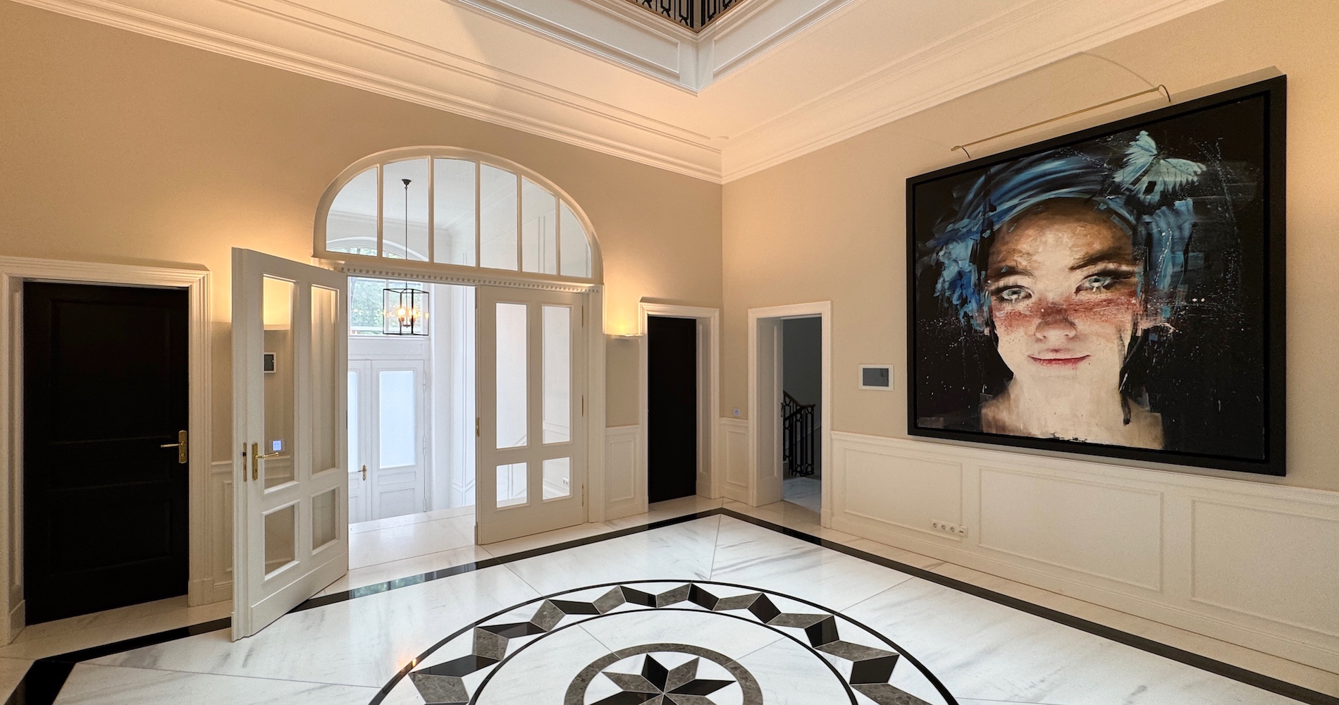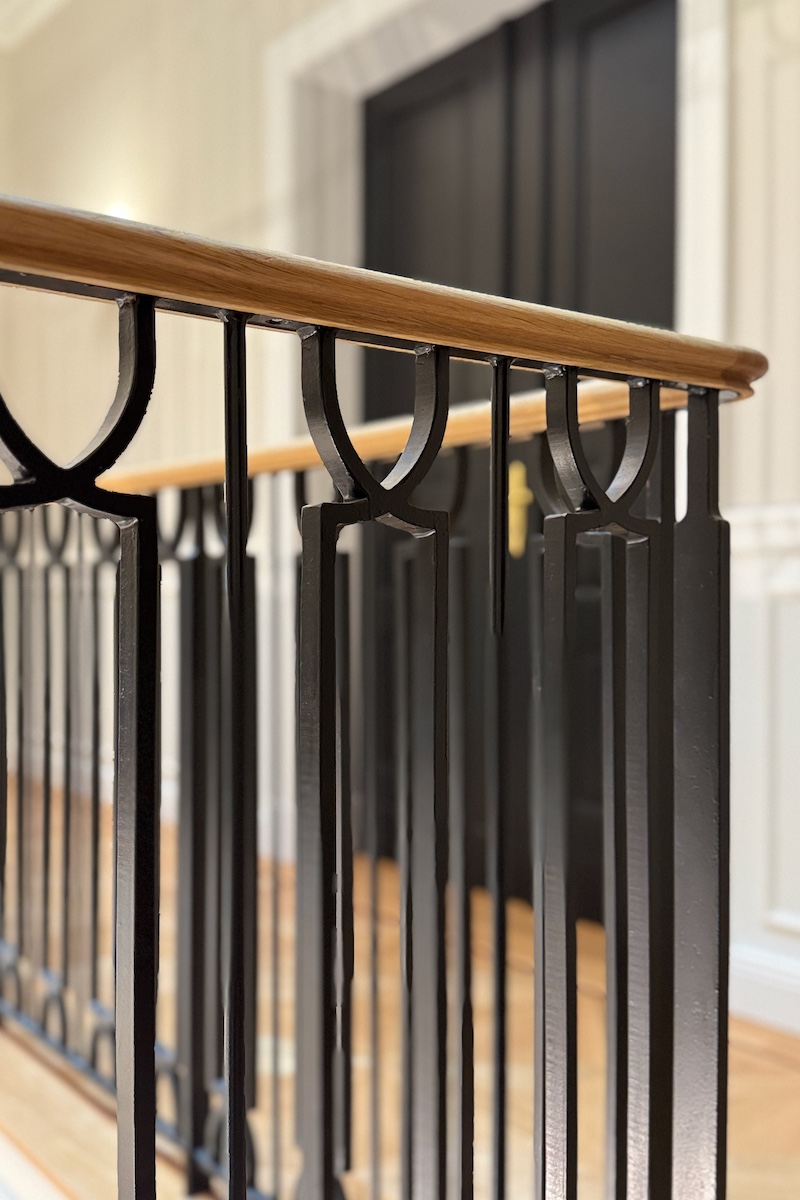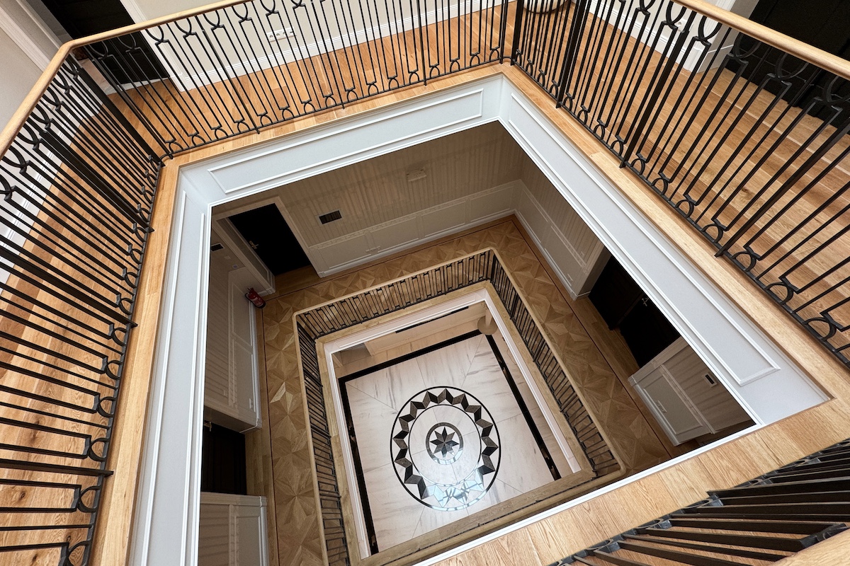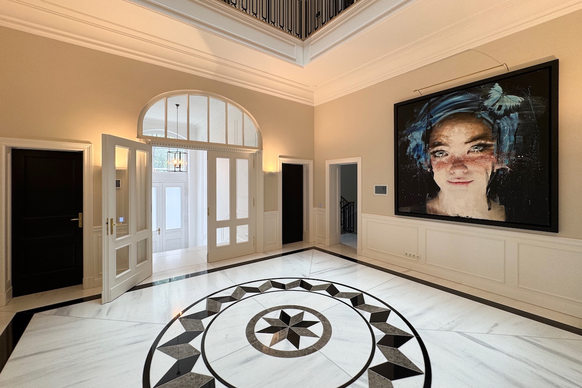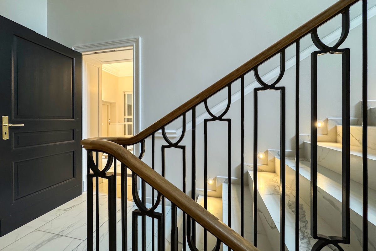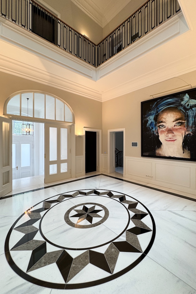 Mein absoluter Favorit: Das für den Bauherren eigens entwickelte Geländer im Atrium und das wunderschöne Natursteinmosaik im Entree.